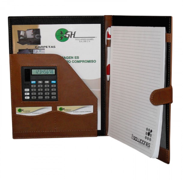 Carpeta: Para convención con trevilla, tarjetero, porta block, porta pluma, porta cd y papelera.