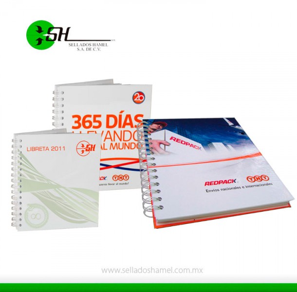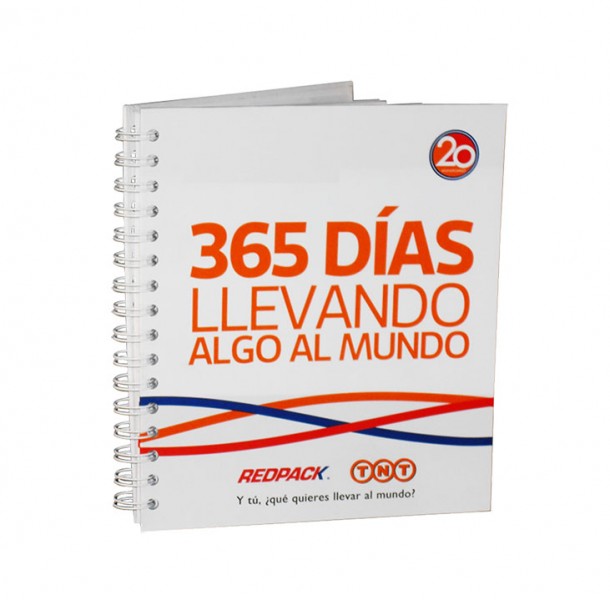 Libreta: De pasta dura en couché plastificado de 135 grs, con 100 hojas de papel bond rayado de 75 grs impresas a 1 X 1 tinta.