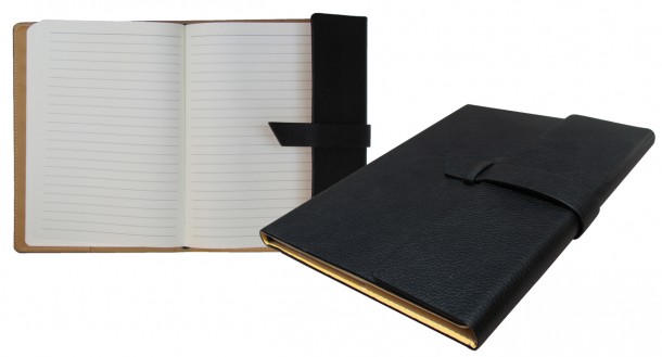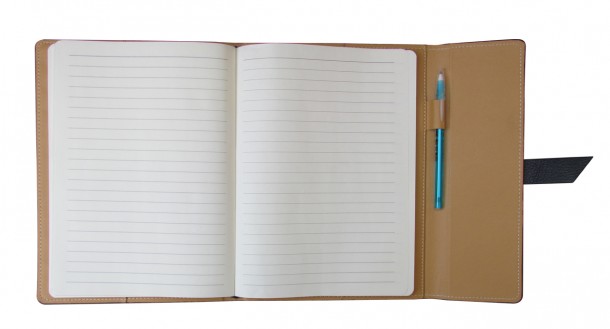 Artículo: Libreta de curpiel exterior e interior con porta pluma y trabilla sujetadora. Encuadernada con 100 hojas en papel bond de 75 grs. impreso a 1 X 1 tinta.