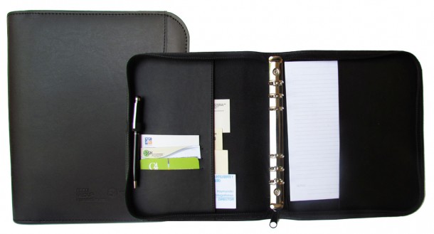 Organizador :Organizador de piel sintetica con cierre, con herraje, portapluma y tarjeteros.