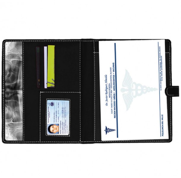 Artículo: Porta recetario tamaño esquela, con broche con imán, tarjeteros, porta credencial y papelera.