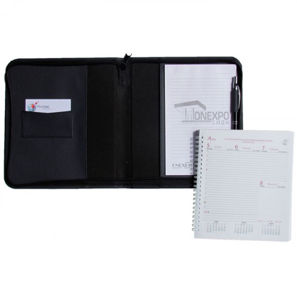 Funda: Curpiel cosido y con cierre, acojinado con alma de cartón. Con porta pluma y tarjetero.